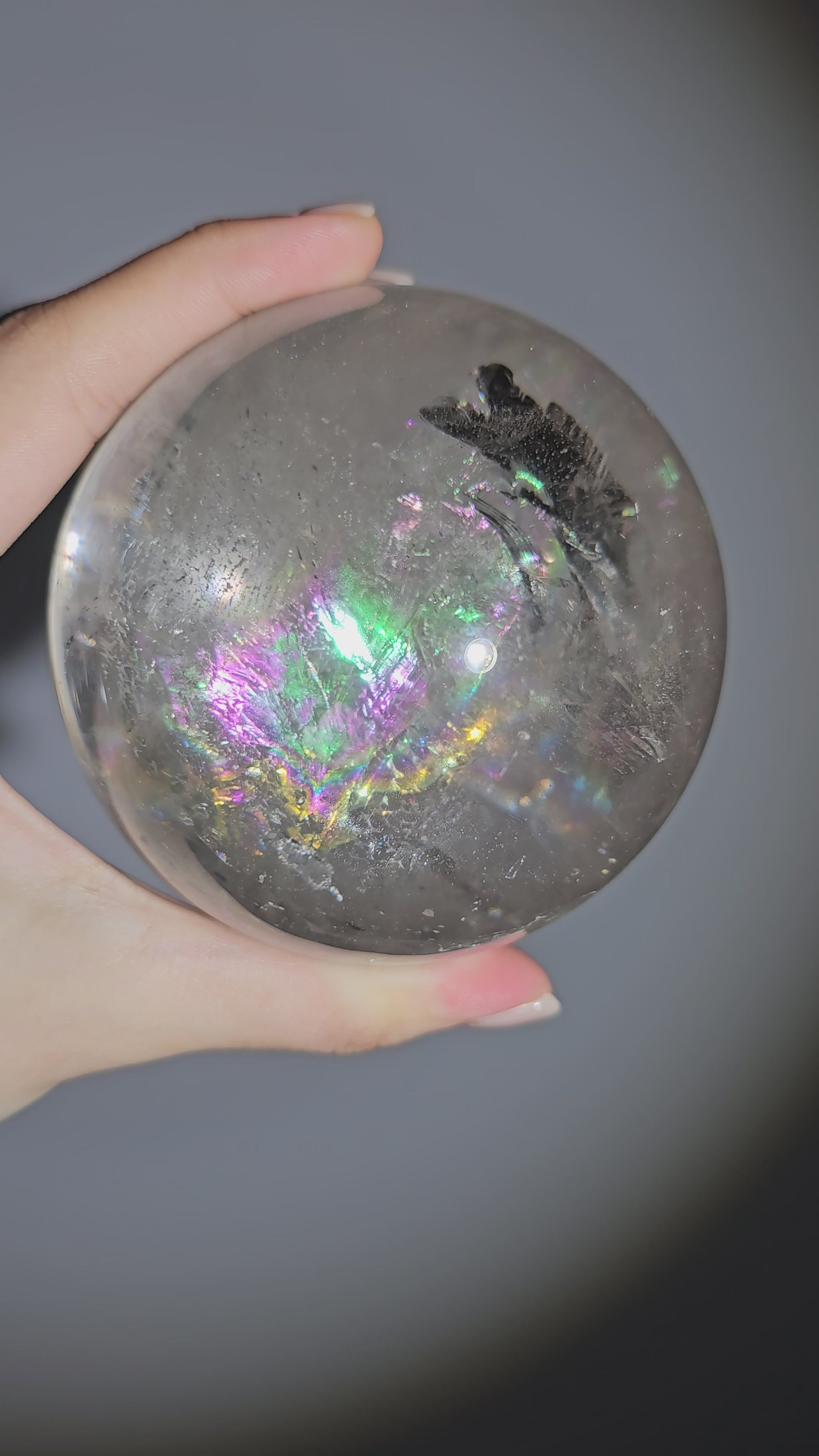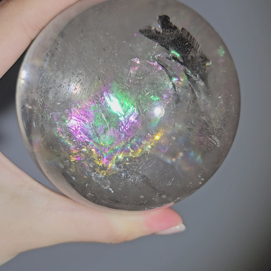 Its internal rainbows are naturally formed through fractures and light refraction, not artificial enhancement. Like all natural quartz, these features are part of its individuality and cannot be replicated.
