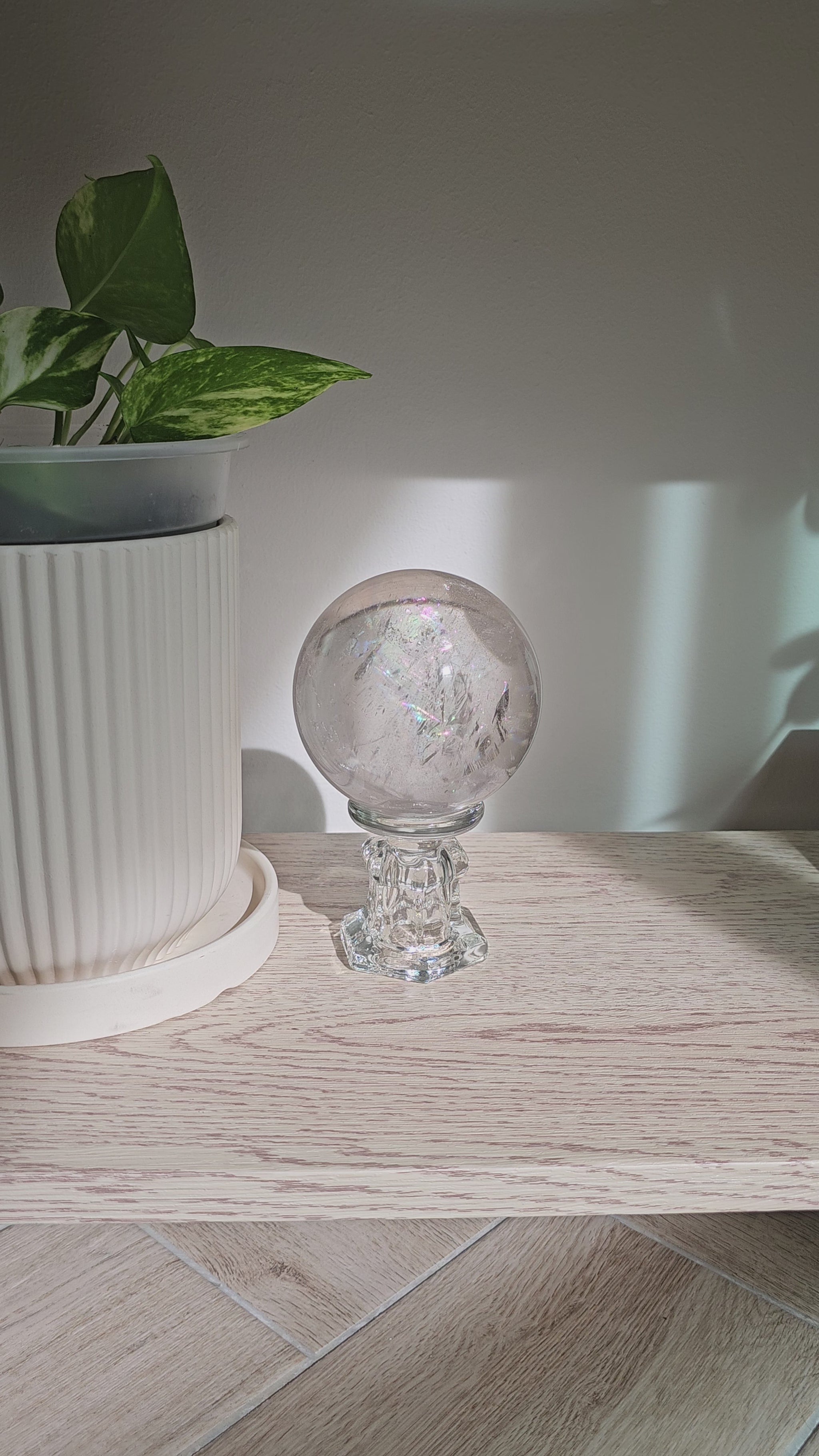 This clear quartz sphere is a natural, untreated piece selected for its clarity, internal structure, and light play. It has been carefully photographed in three conditions to show its true character: