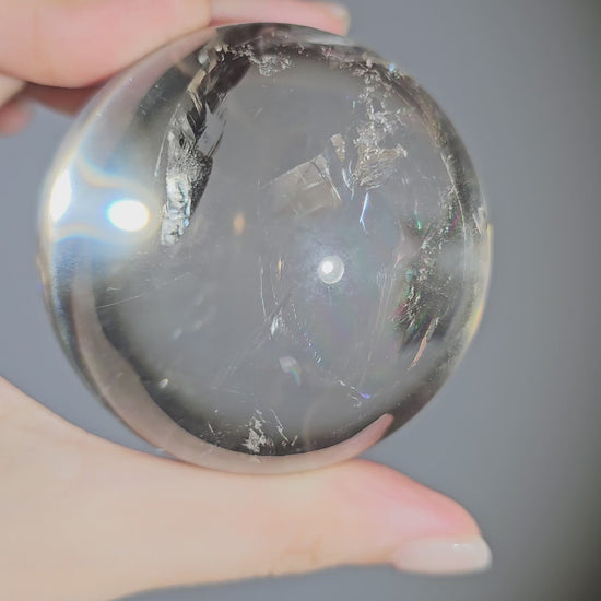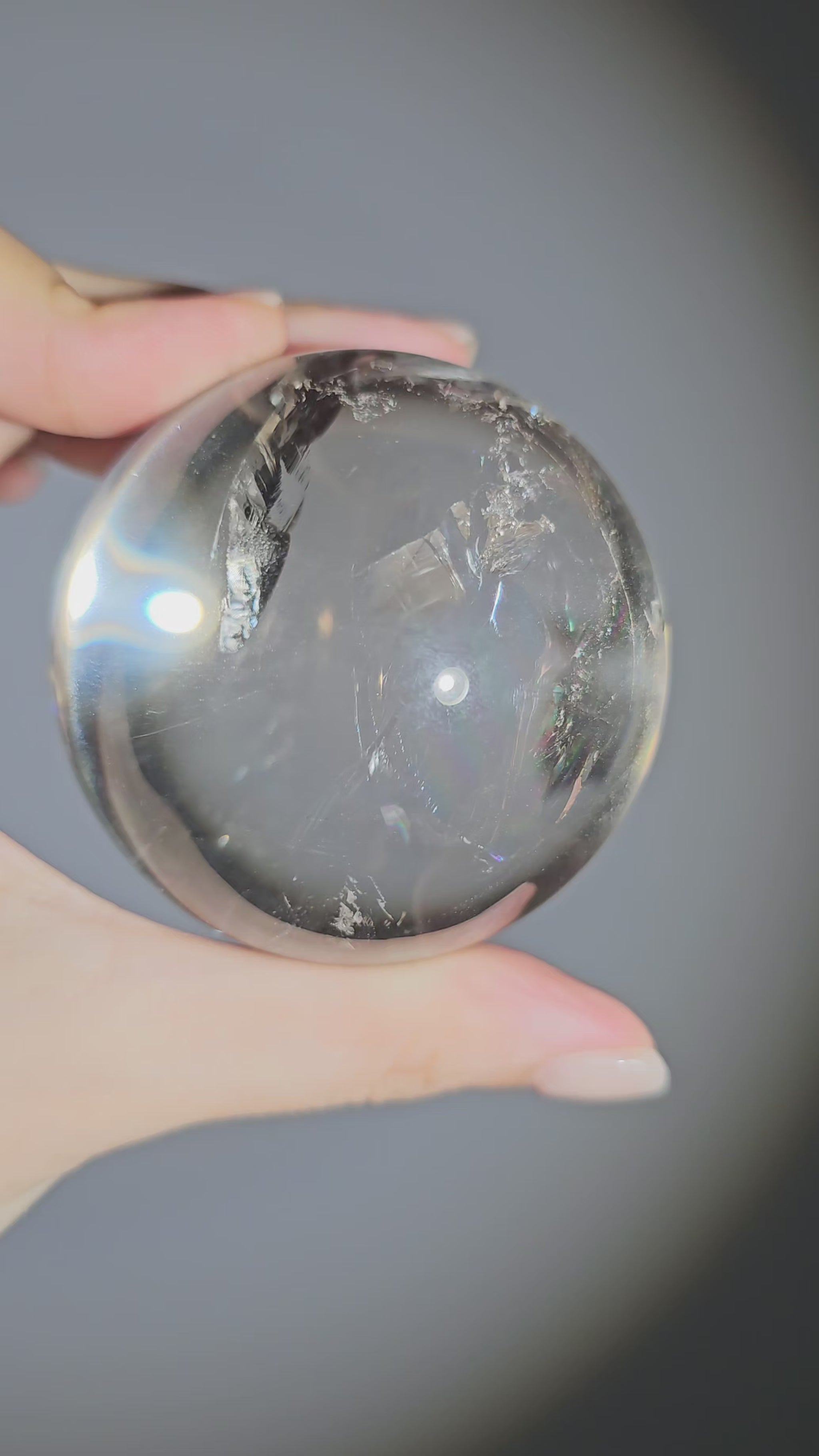 This clear quartz sphere is a natural, untreated piece selected for its clarity, internal structure, and light play. It has been carefully photographed in three conditions to show its true character: