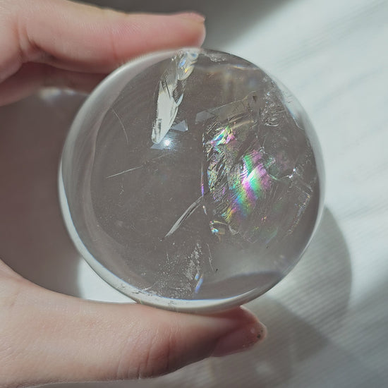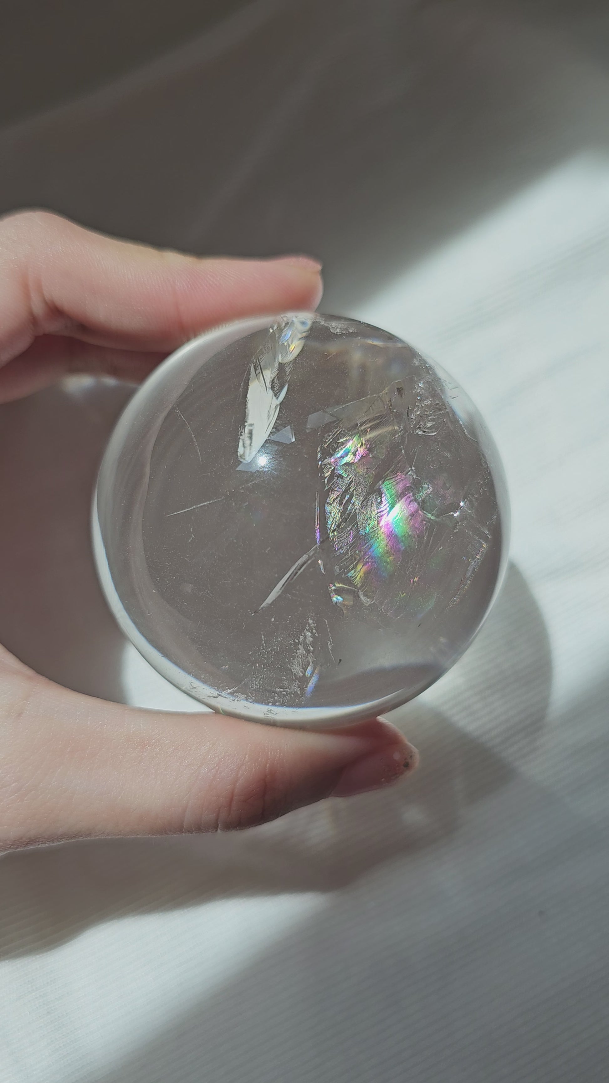 Its internal rainbows are naturally formed through fractures and light refraction, not artificial enhancement. Like all natural quartz, these features are part of its individuality and cannot be replicated.