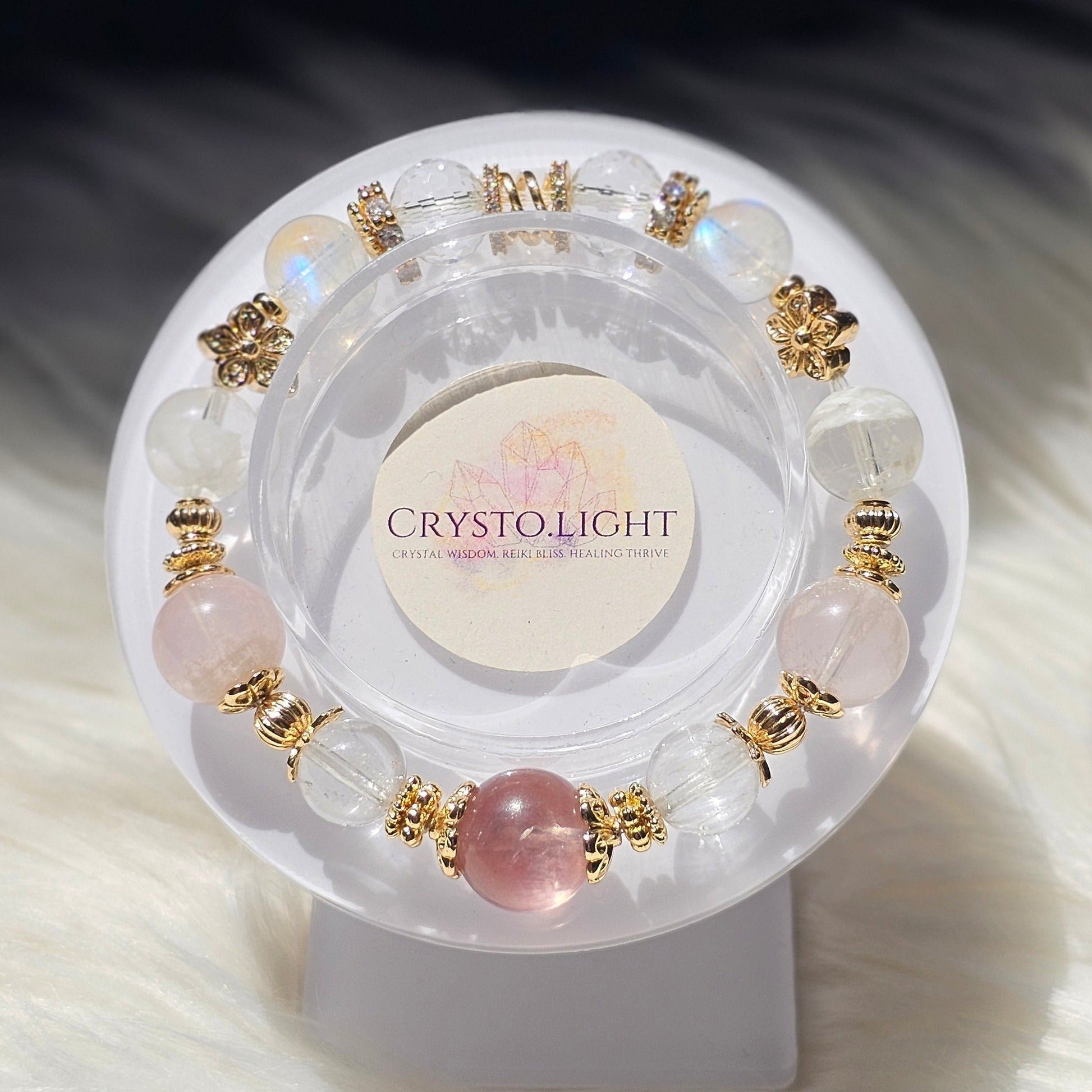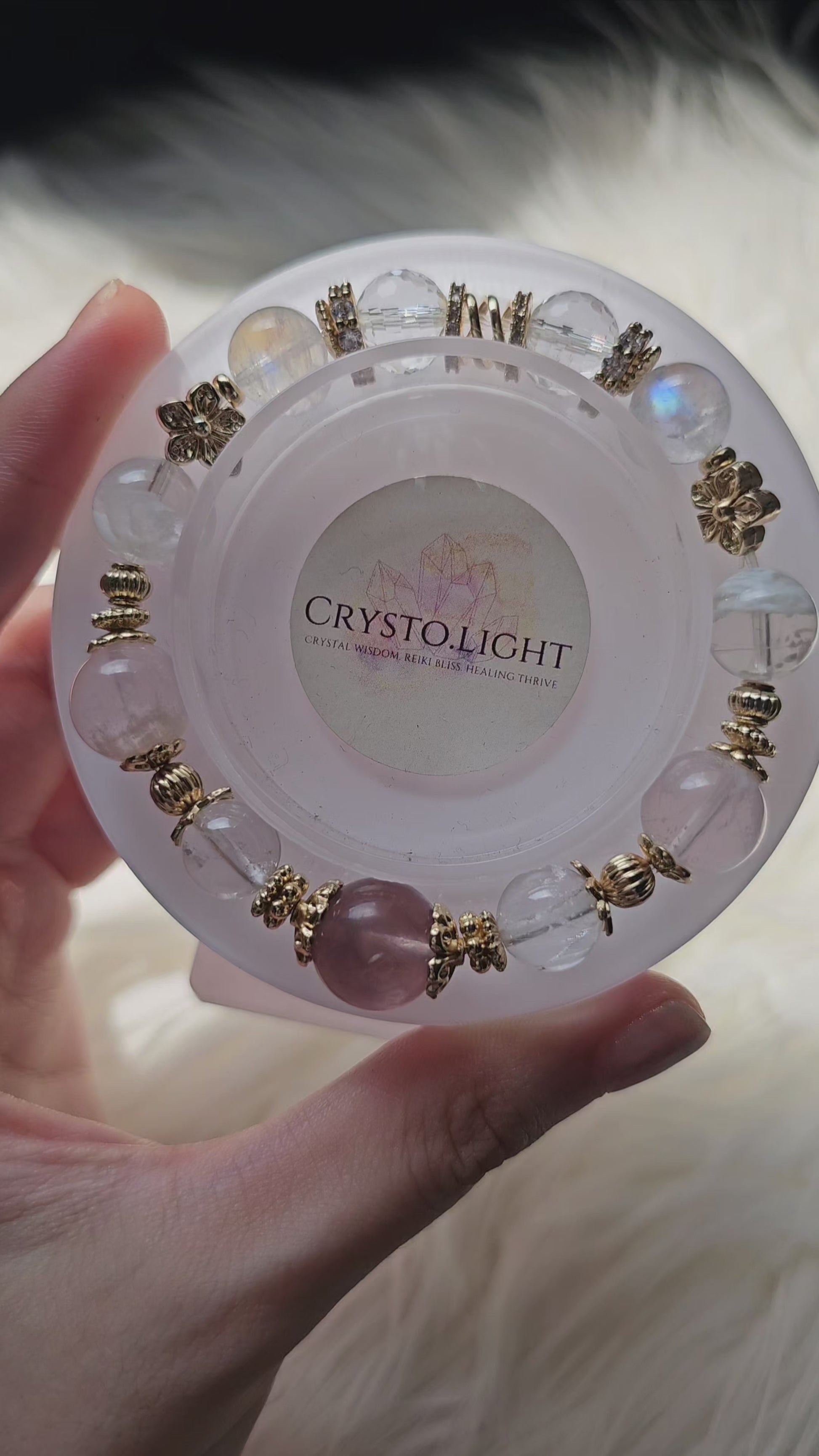 Explore the enchanting properties of Frosty Moonlight Symphony featuring Snow Garden Rose Quartz, Snow White Phantom, Moonstone, Gem Lepidolite, and White Topaz.