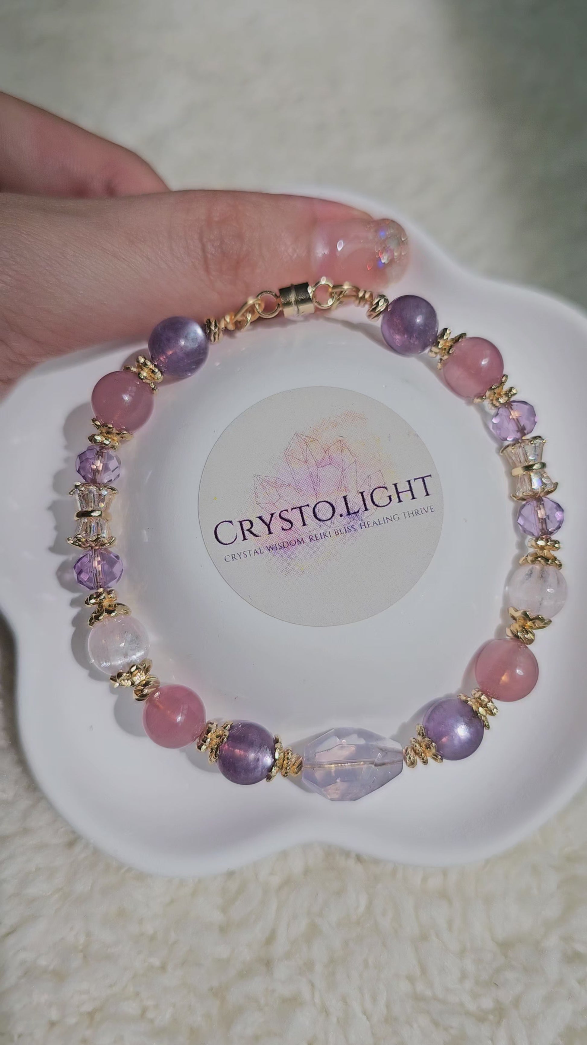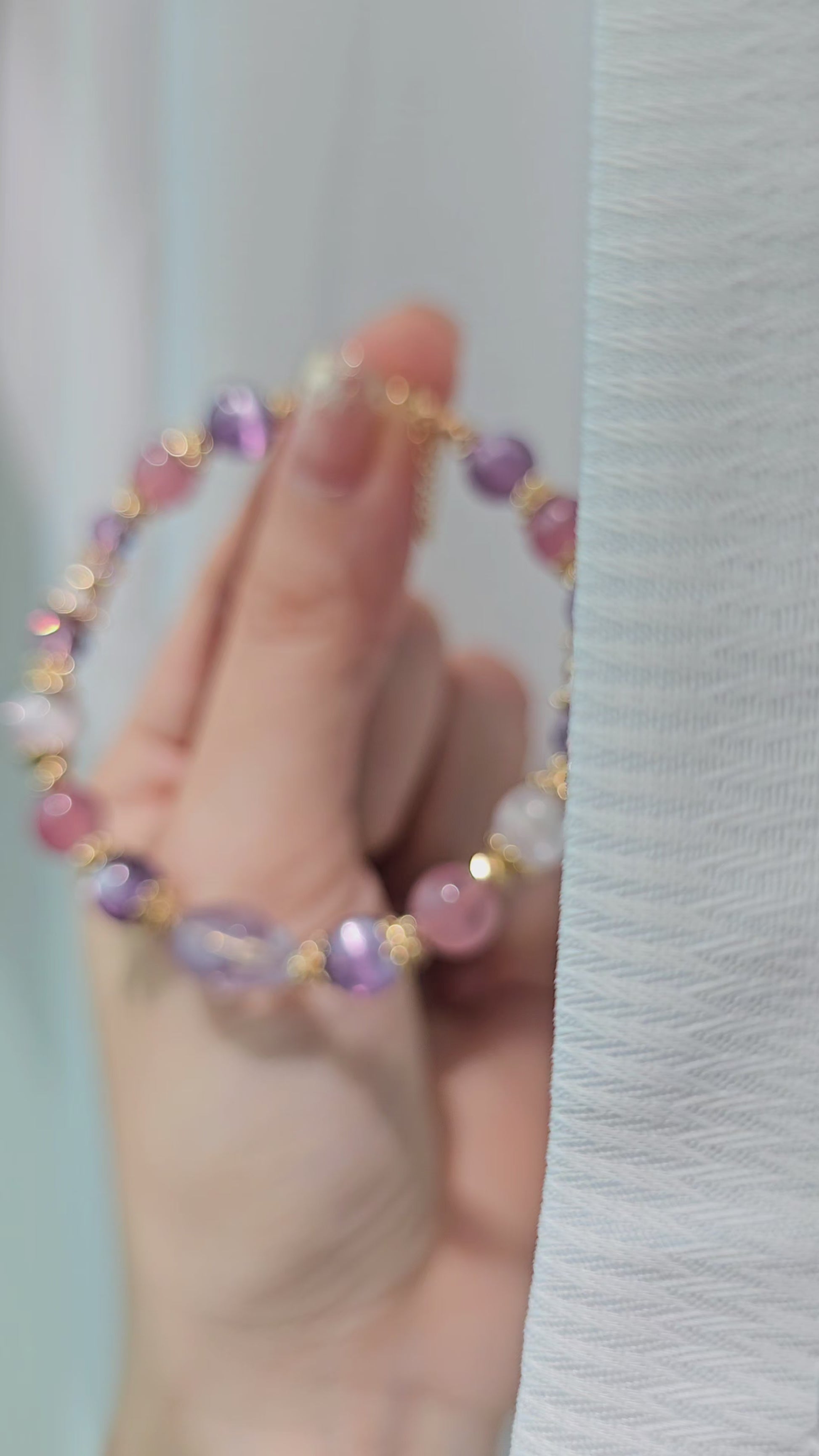 Beads used: Lavender Moon Quartz, Purple Gem Lepidolite, Old-Mine Mozambique Rose Quartz, Kunzite, Amethyst