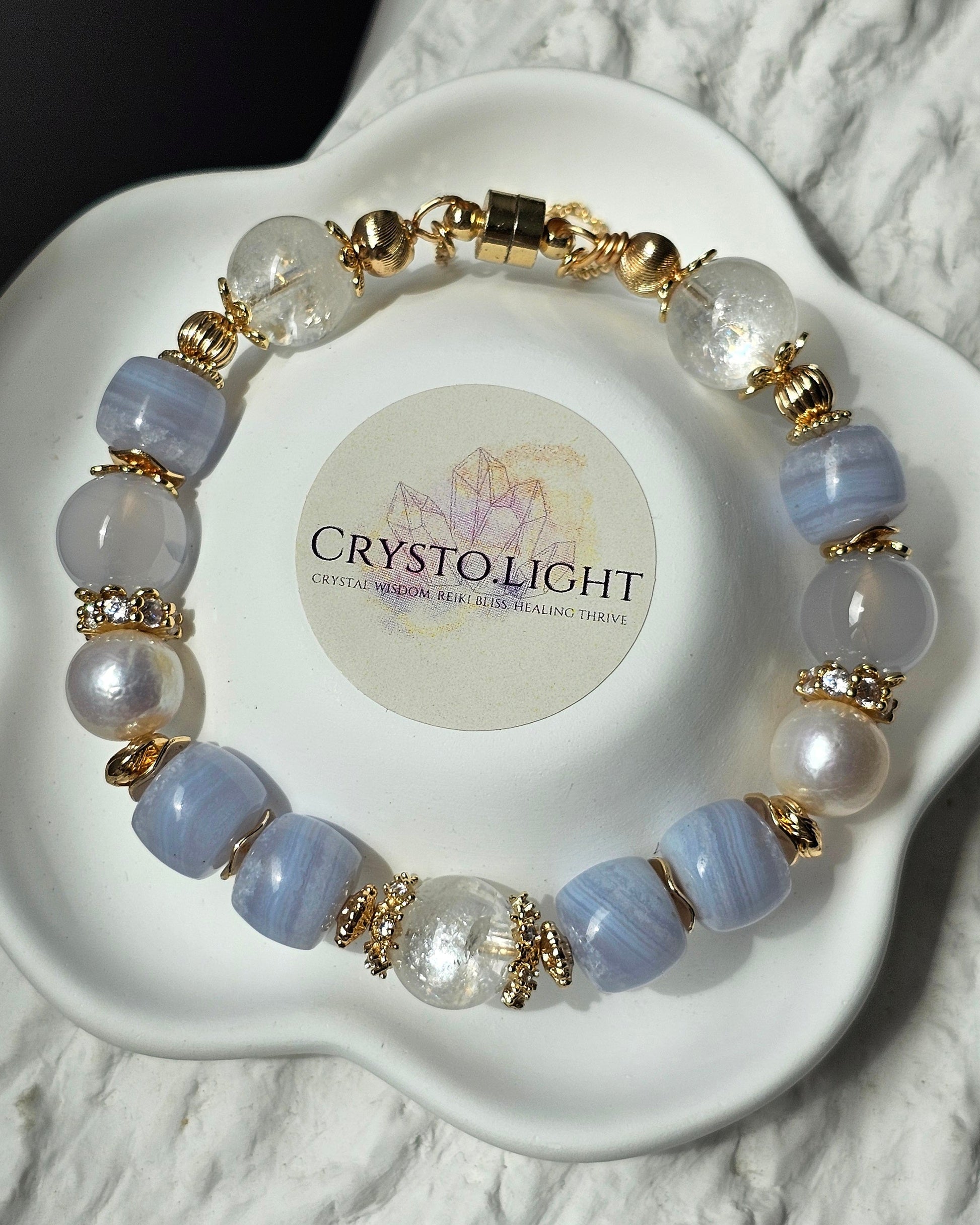 Beads used: Glacier Clear Quartz, Blue Lace Agate, Blue Chalcedony, Freshwater Pearls
